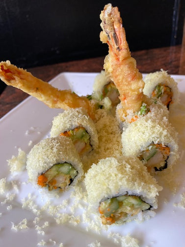 Shrimp tempura, Avocado, Cucumber, Smelt eggs, Sweet Eel Sauce, and Crunchy Temple flakes on top.