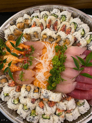 6 Pc Tuna, 6 Pc Yellowtail, 6 Pc Albacore, 6 Pc Salmon, 4 Pc Shrimp, 2 California Roll(16pc) , 2 Spicy Tuna Roll( 16 Pc ) , 2 Spicy Albacore Roll (16pc) , 1 Eel Roll( 8 Pc)
