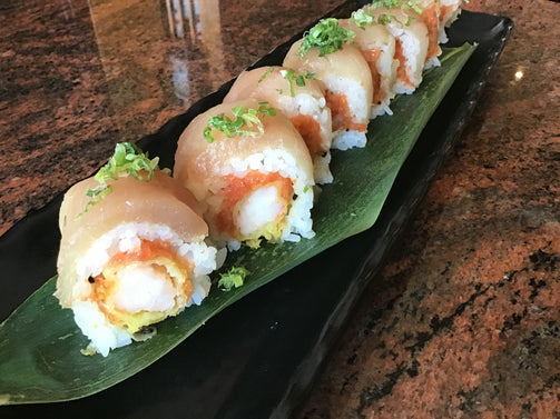 Spicy Tuna, Jumbo Shrimp Tempura With Albacore And Scallion On Top With Spicy Yui Sauce, Garlic Ponzu, Soy Paper